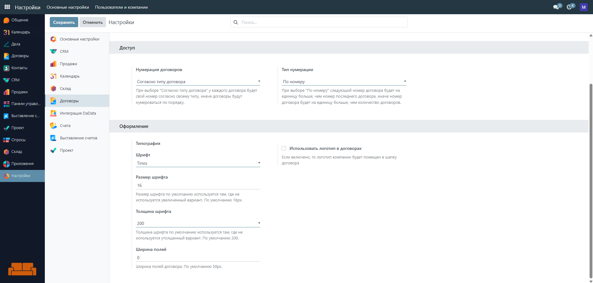 Можно выбрать шрифт (8 шрифтов на выбор), размер полей, толщину и размер шрифта, а также разместить логотип компании в шапке договора и настроить его положение.