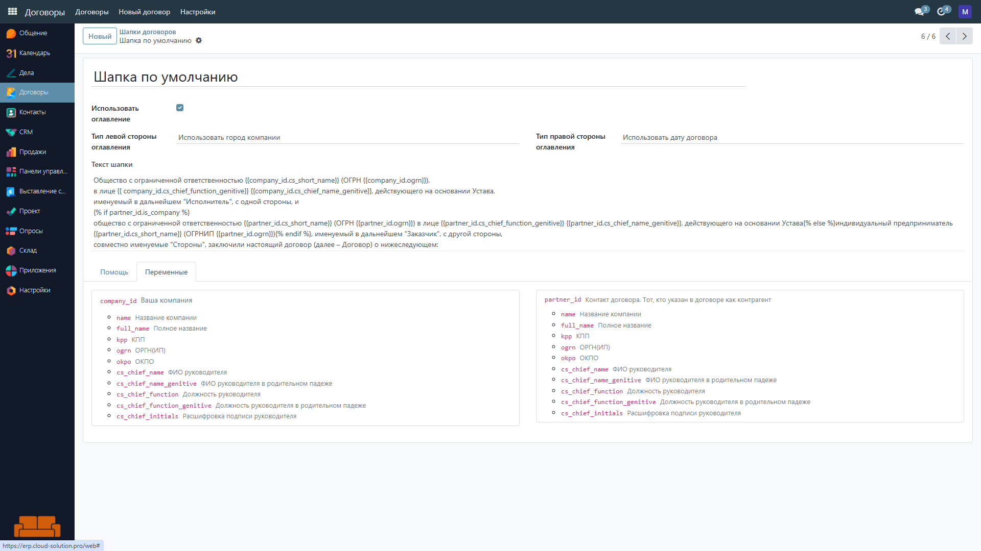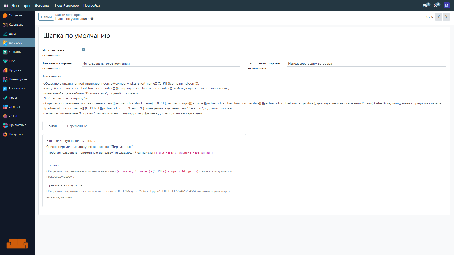 Но если вам нужна индивидуальная шапка договора, то её можно создать в любой момент, используя подсказку по оформлению шапки. В шапке можно использовать переменные, которые будут заменены на реальные значения при печати договора.