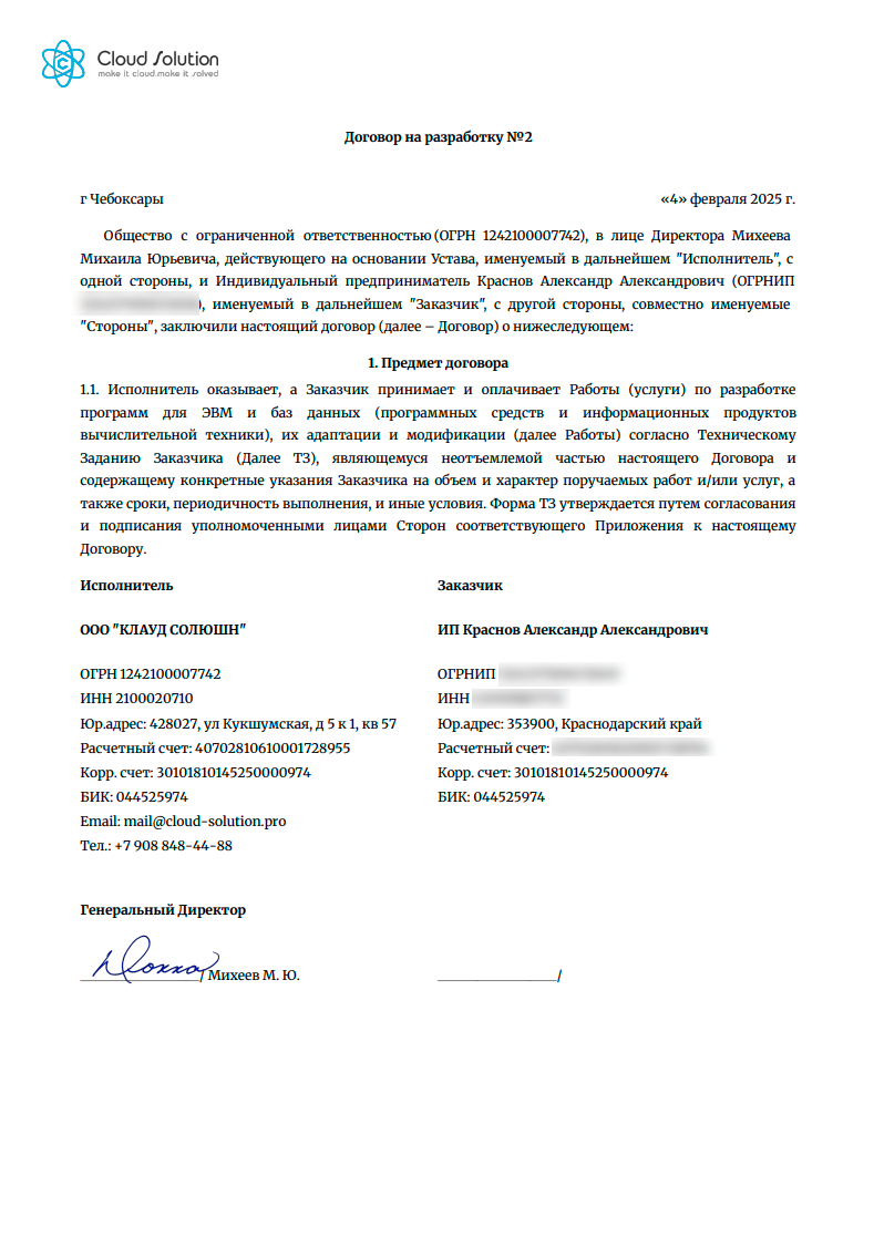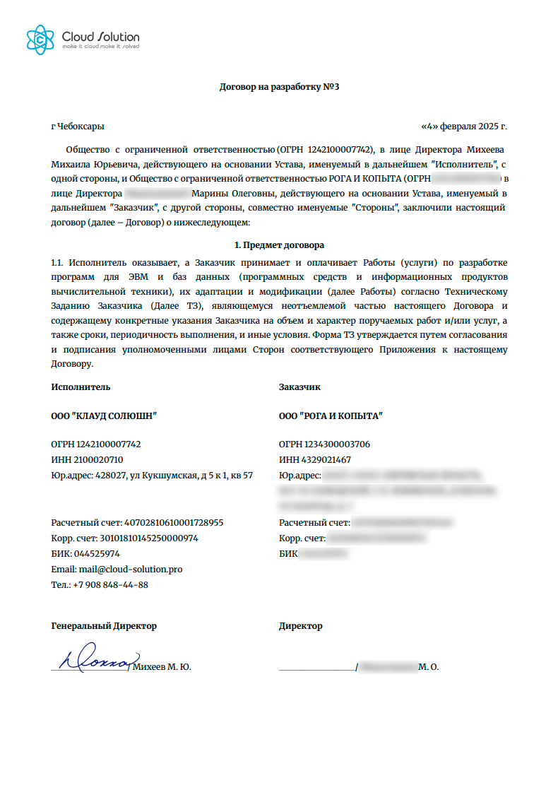 На скриншоте показаны примеры договоров c одним пунктом. Используется шапка, которая есть в модуле по умолчанию - текст для ИП и ООО разный.