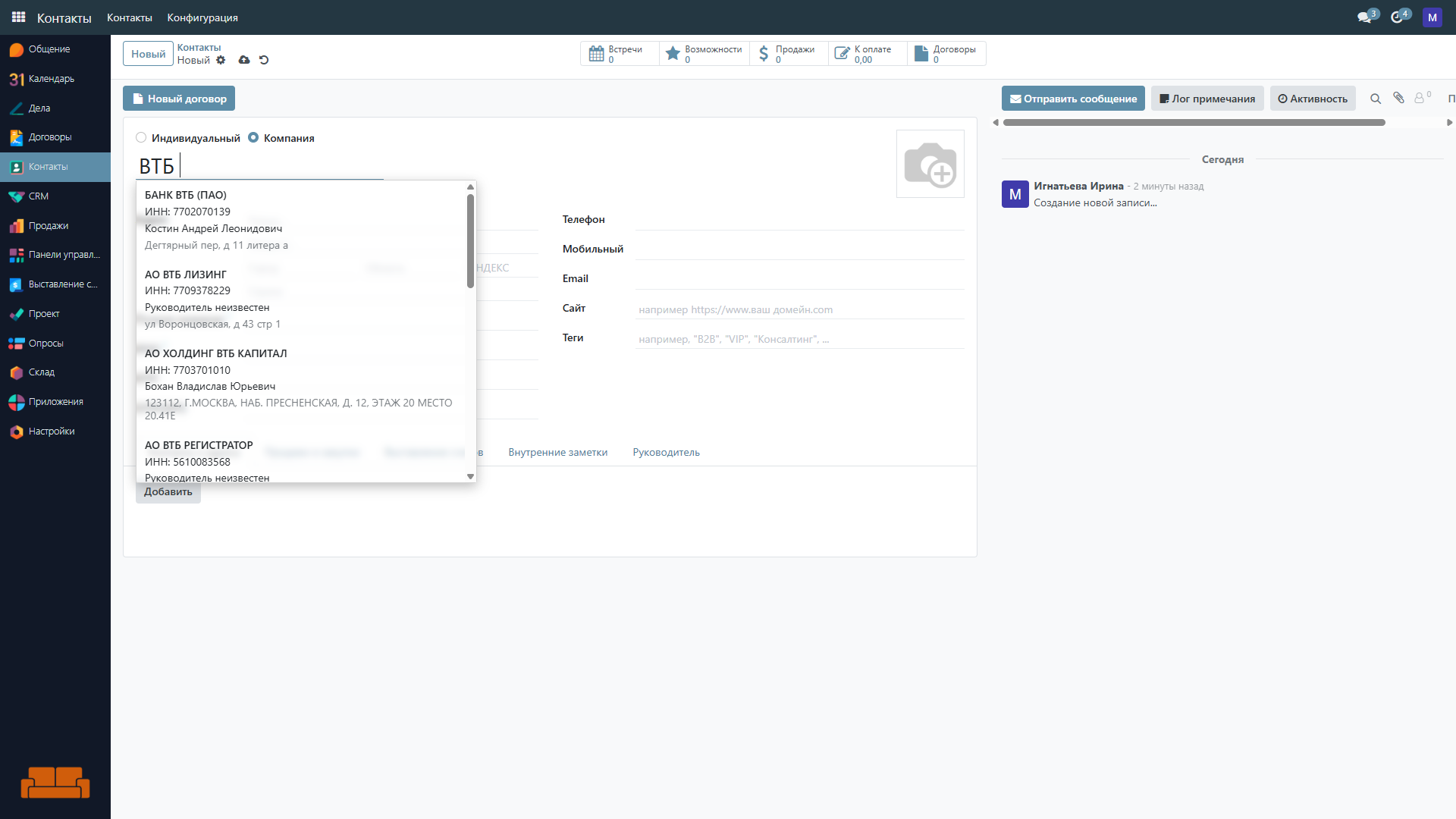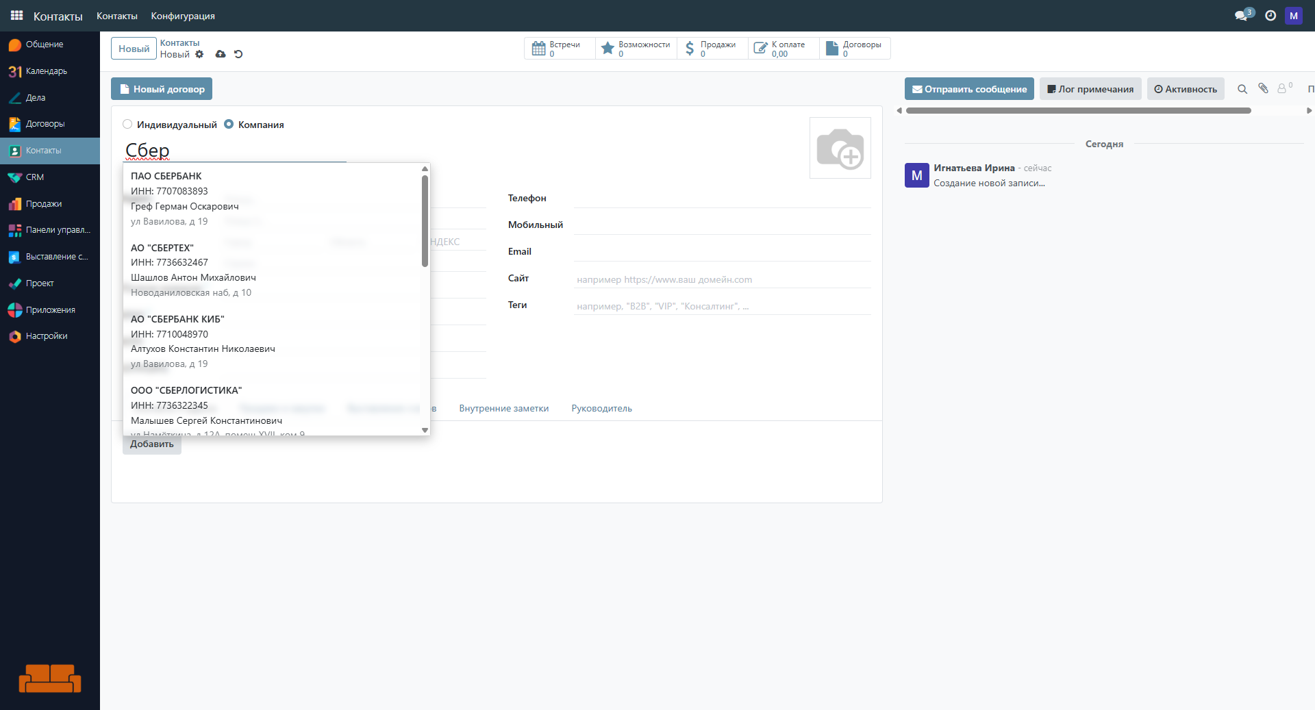 Мгновенное заполнение реквизитов компаний по ИНН или названию. Проверка адресов и автоматическое создание карточек руководителей