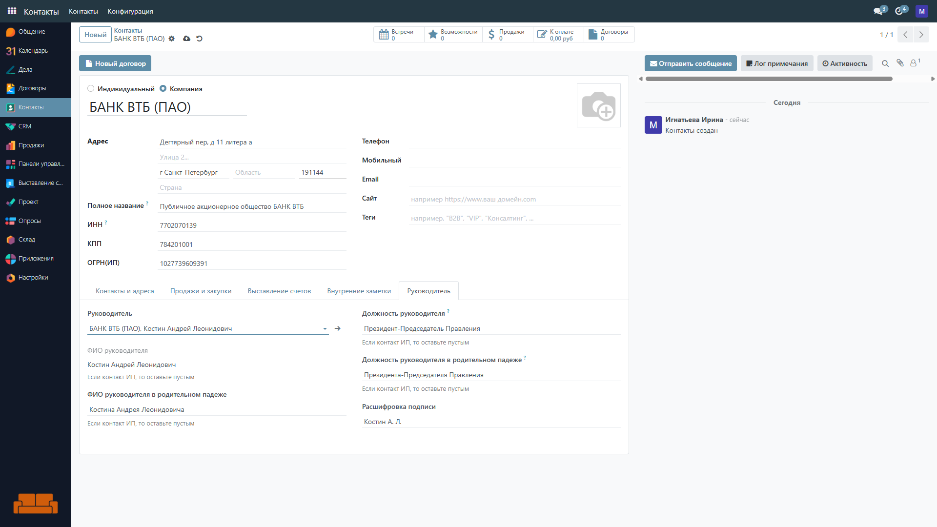 При нажатии на элемент подсказки и сохранения карточки, система автоматически рассчитает родительский падеж имени руководителя, а также подставит его инициалы в соответствующее поле. Это отлично сочетается с нашим модулем "Договоры" - вместе эти два модуля создают удобную интеграцию, так как родительский падеж и инициалы там используются.